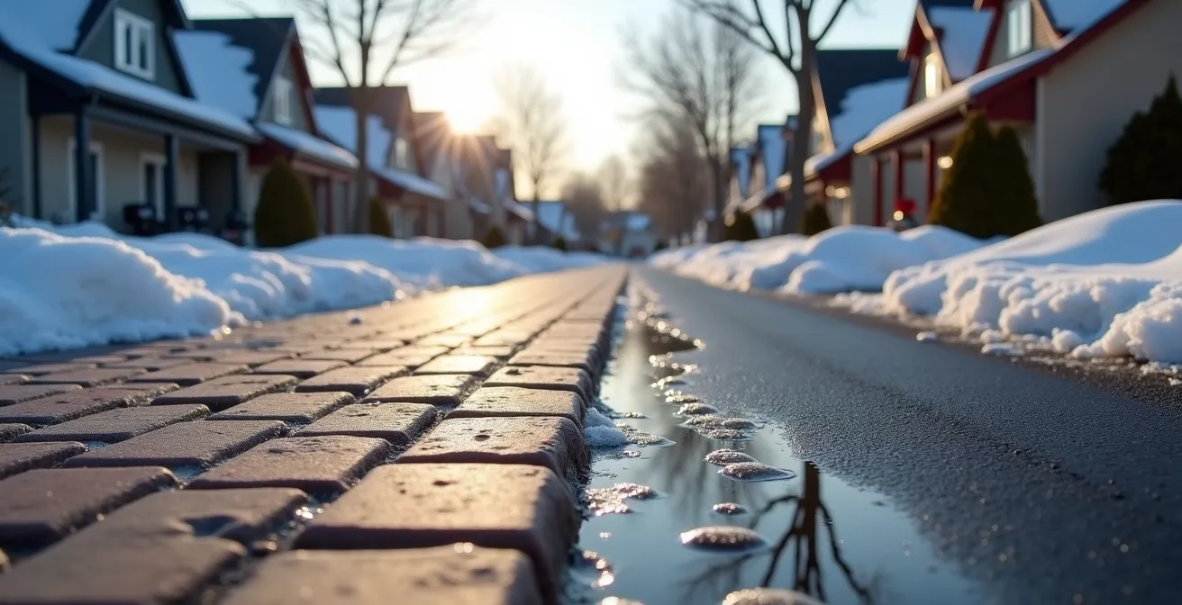 Le débat classique pavé vs asphalte passe à côté de l’essentiel. Il occulte le véritable ennemi de votre aménagement : les forces colossales et invisibles qui s’exercent sous la surface. Le climat québécois, avec ses cycles de gel et de dégel intenses, impose des contraintes uniques. L’eau s’infiltre, gèle, prend de l’expansion et exerce une pression immense sur tout ce qui l’entoure. C’est cette dynamique, et non le choix du matériau de finition, qui détermine si votre entrée restera impeccable ou se transformera en un champ de bosses après quelques hivers.